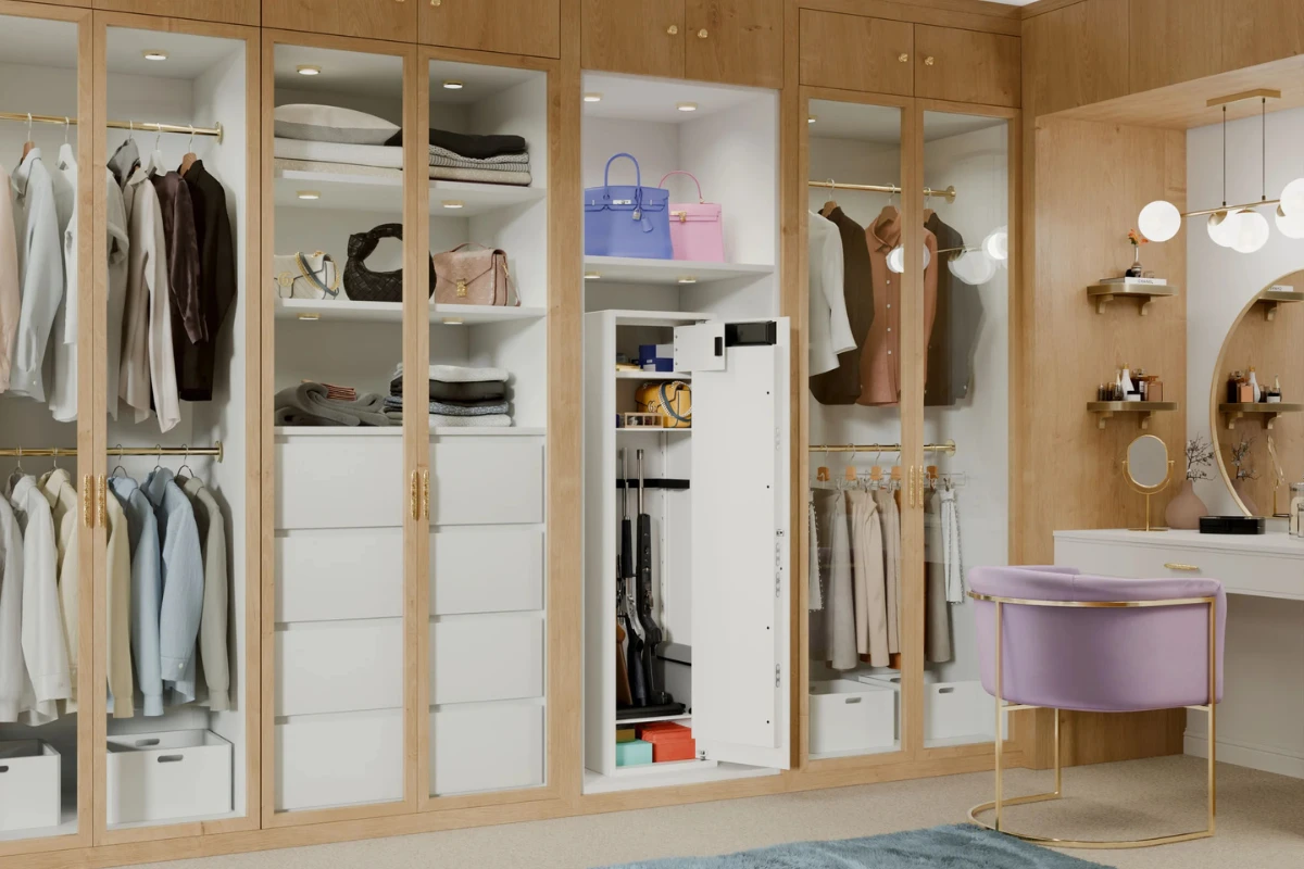 Closets are a great space for secure storage. We offer a full line of MyCube safes-secure and stylish home safes that are great for jewelry safekeeping, important documents and valuables. We carry compact sizes, including the MyCube and Mycube Mini safes that fit on our closet shelving. We also carry large fire-rated safes that are great for firearm storage and other large items. If you want to hide your safe, we can build cabinetry around it so that it is concealed and matches the finish of your closet. If not, MyCube carries a variety of colors and clean, modern styles.