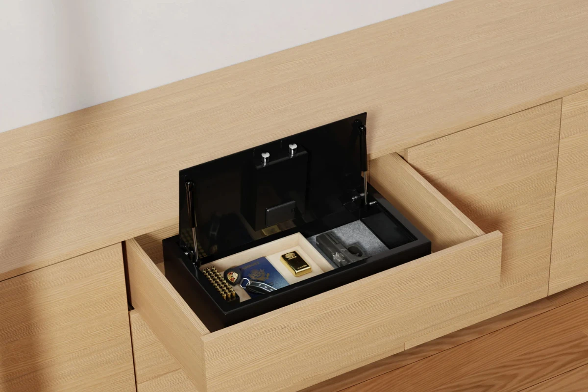 In addition to MyCube safes, we offer our clients the ability to conceal their valuables even further with built-in drawer safes. Built into a normal bank of drawers in the closet, these drawers open a few inches to reveal a keypad. Once the code is input, the drawer and safe fully open. This is a convenient way to store jewelry and passports-valuables and important documents that you access more regularly than other items that are usually stored in safes.