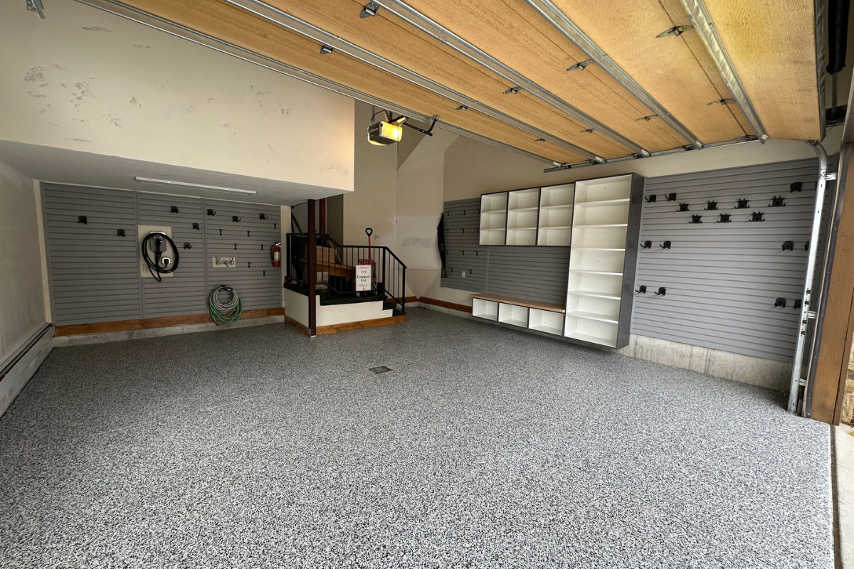 8. Jul. 2025 / by IsabellaC / / 0 comments Epoxy Flooring Commercial grade epoxy floorEpoxy floor recently installedEpoxy garage floor with slatwallGarage Cabinets in Slate, Butcher Block Countertop, Gray Slatwall, Epoxy Floor Closets Garages Cabinets